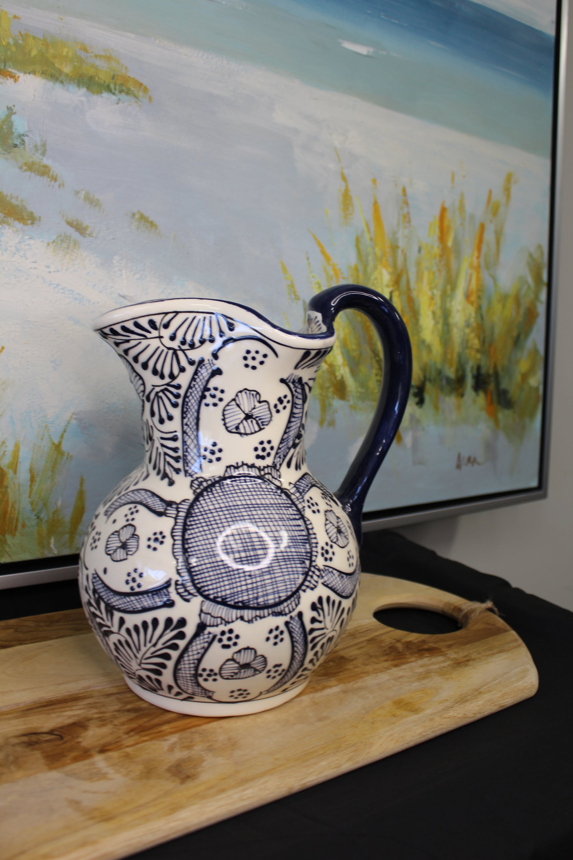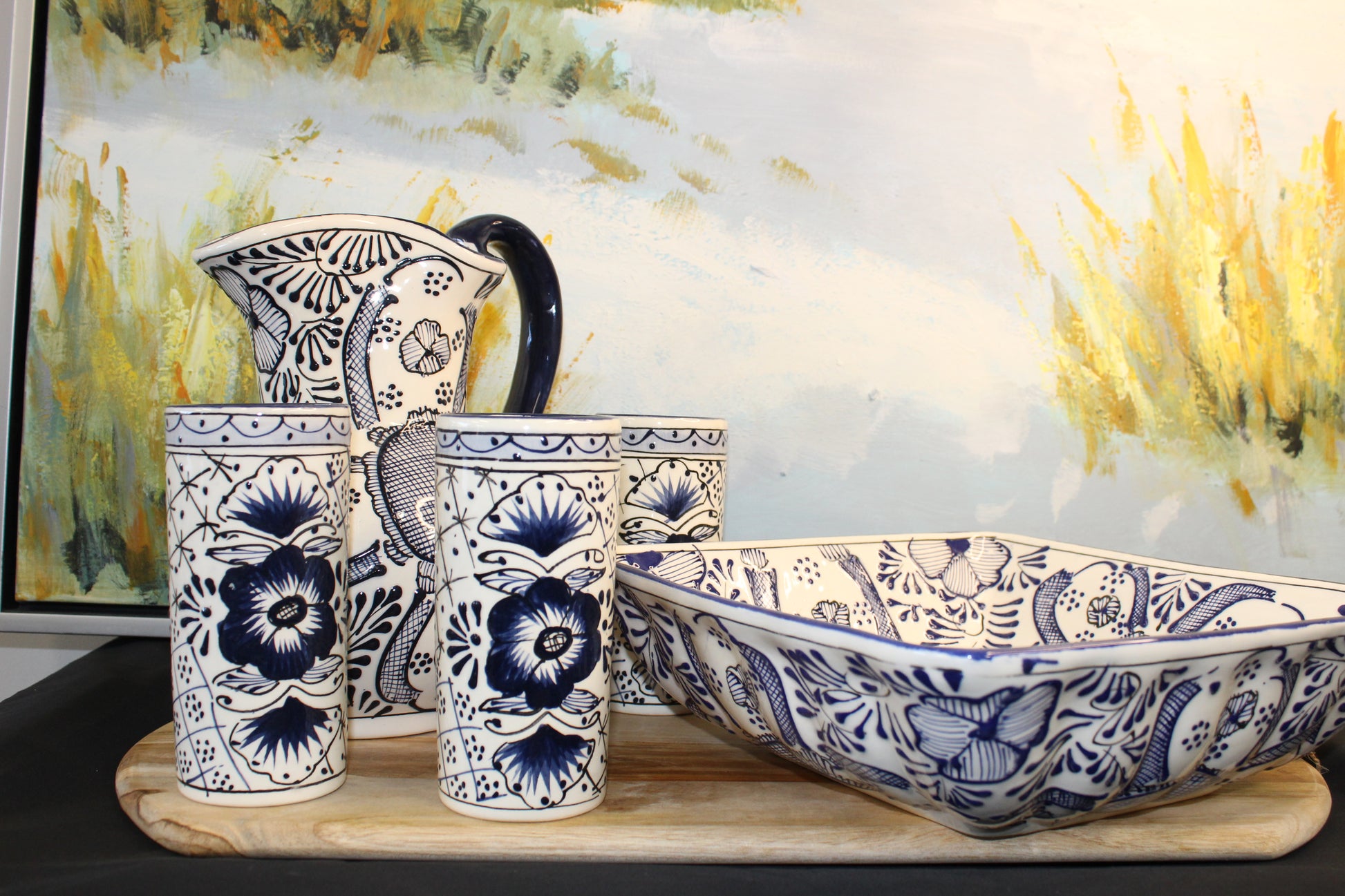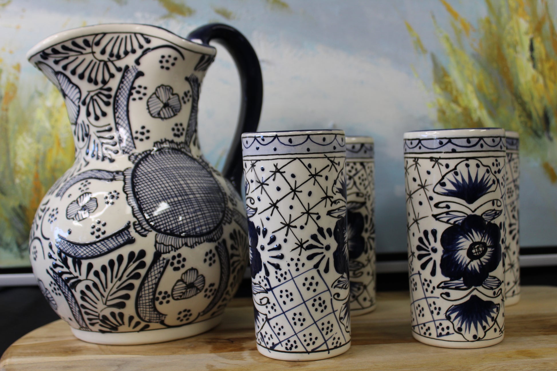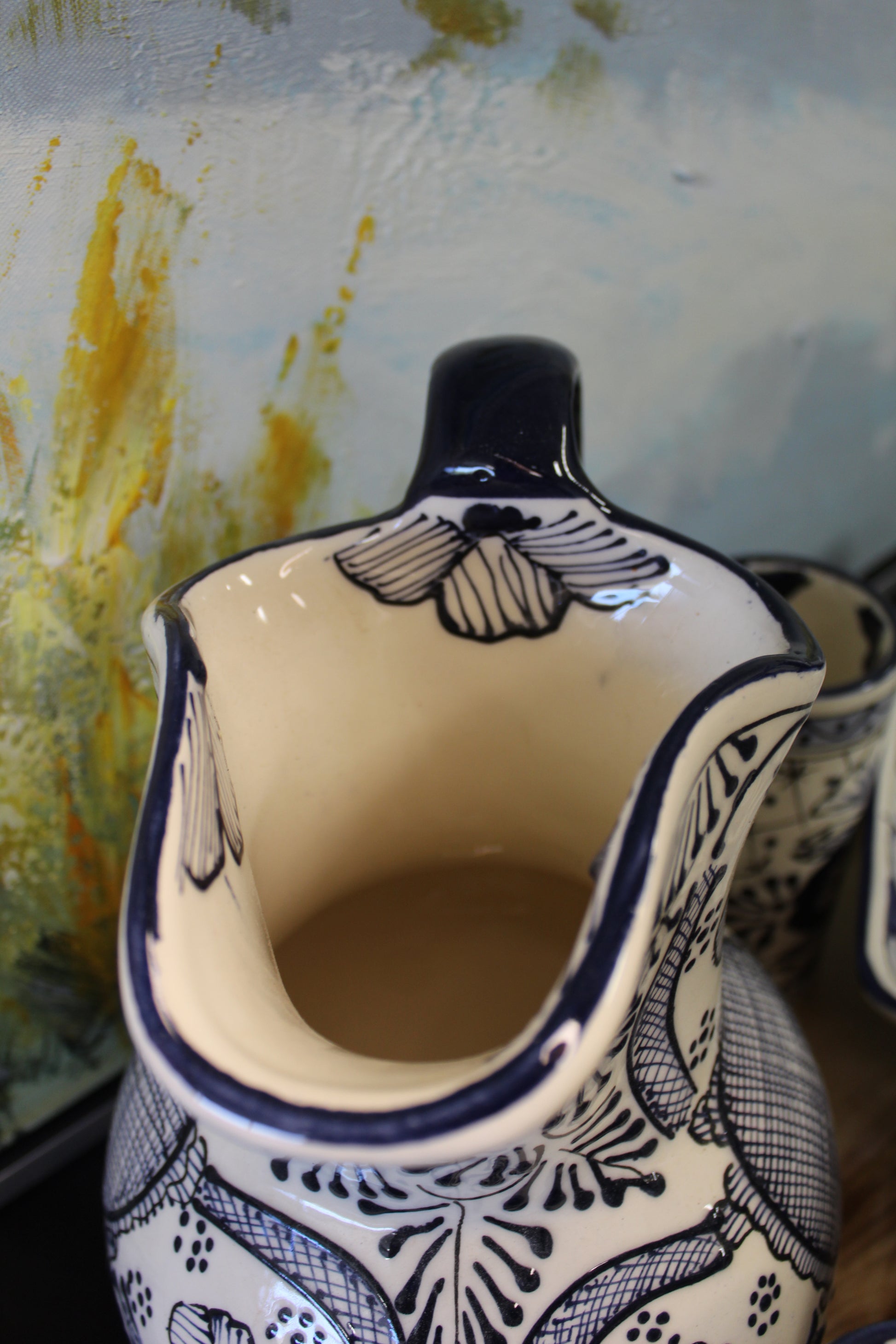Introducing Snow and Sapphire, a unique and hand-painted ceramic set from a family-owned business in Jalisco. This beautiful blue set includes 12 cups and a pitcher, each with a delicate flower design. Perfect for holiday gatherings or any occasion, add a touch of elegance to your table with this one-of-a-kind set.