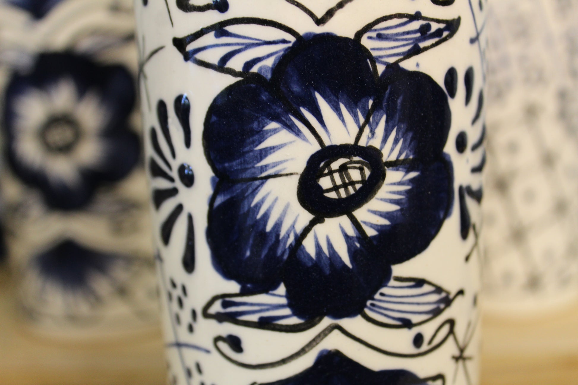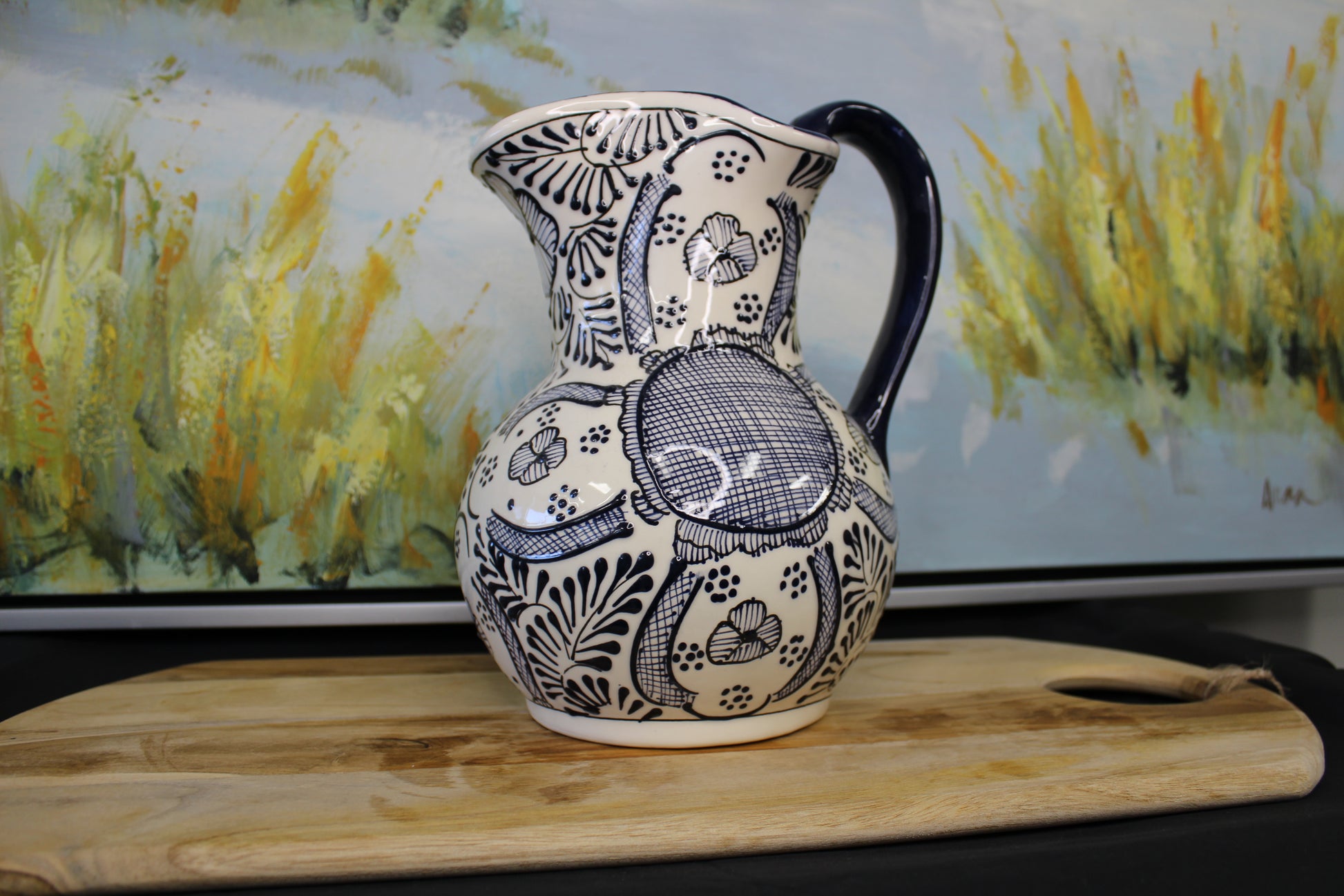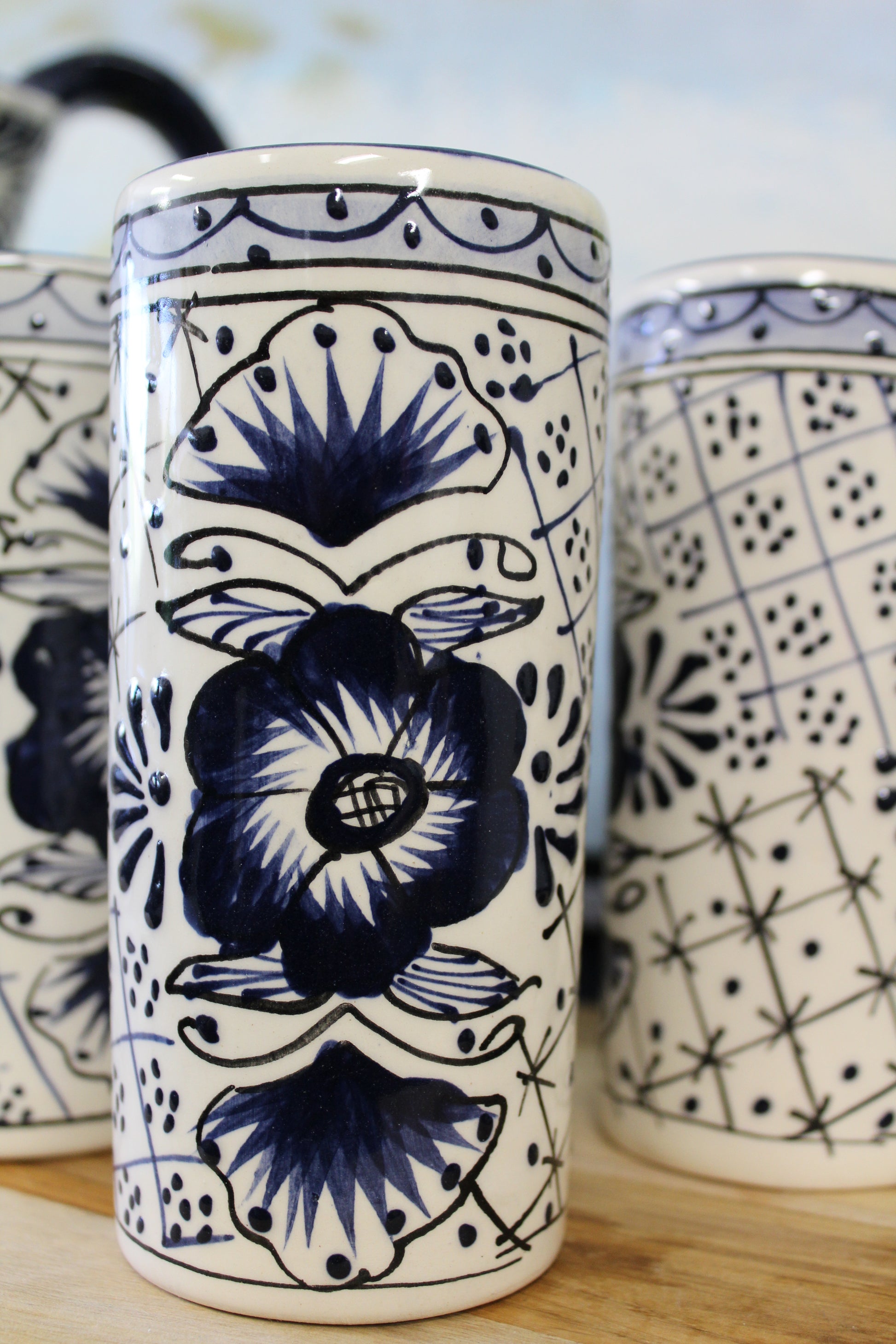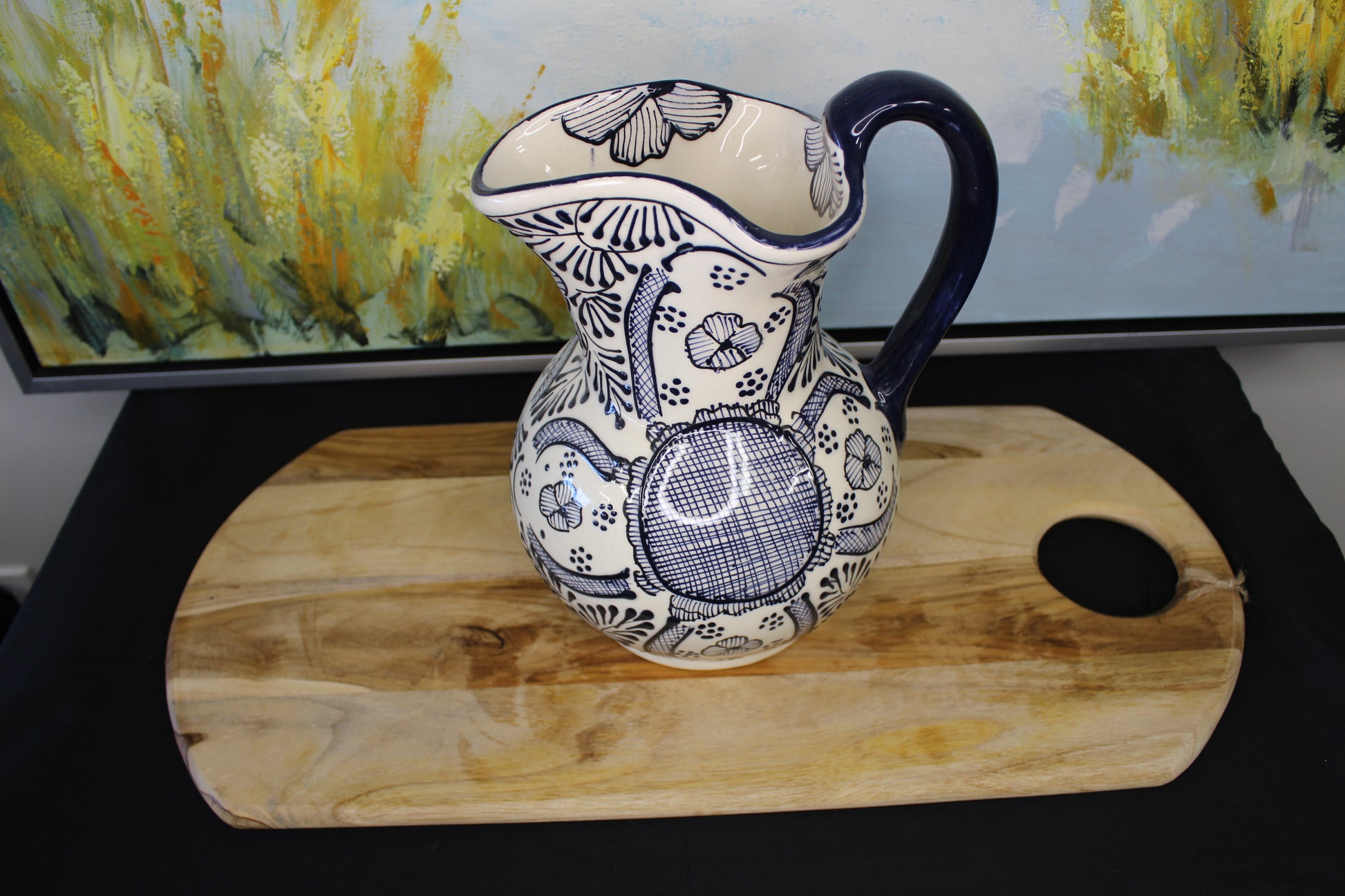Introducing Snow and Sapphire, a unique and hand-painted ceramic set from a family-owned business in Jalisco. This beautiful blue set includes 12 cups and a pitcher, each with a delicate flower design. Perfect for holiday gatherings or any occasion, add a touch of elegance to your table with this one-of-a-kind set.